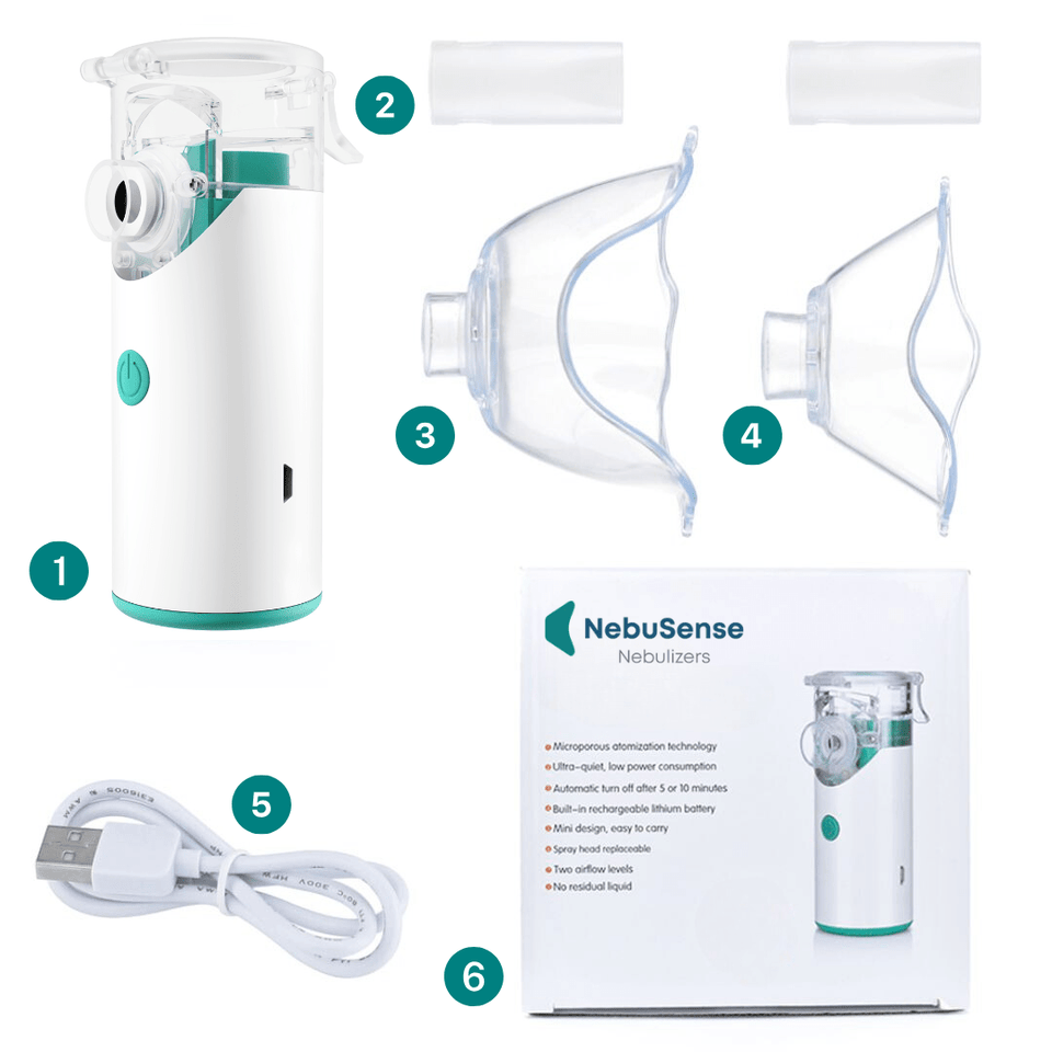 Everything you need to use the nebulizer: portable nebulizer, adult mask, children’s mask, 2 mouthpieces, charging cable, and instruction manual.